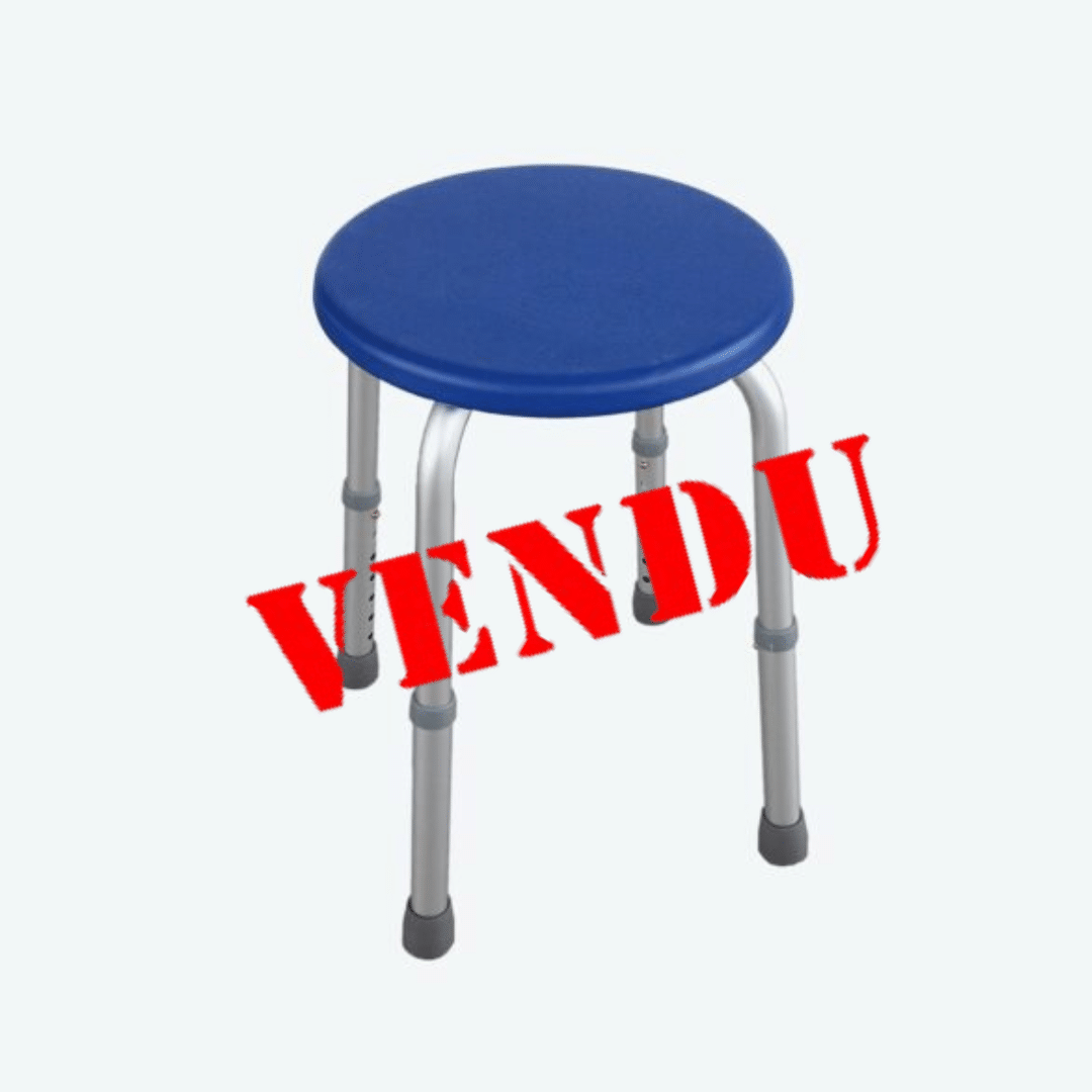 Tabouret de douche à hauteur d’assise/sol réglable de 34 à 49 cm muni d’une assise bleue de 32 cm de diamètre.